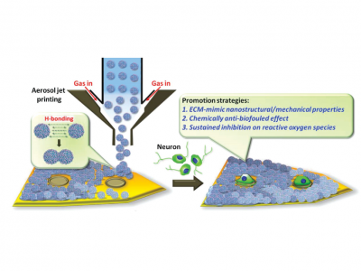 通過(guò) Aeosol Jet 直接在神經(jīng)探針上打印 OPMSC 懸浮液形成圖案,創(chuàng)建抗炎神經(jīng)界面;OPMSC:以兩親性聚二甲基硅氧烷修飾的N,O-羧基殼聚糖(PMSC)與低聚原花青素(OPC)復(fù)合,研制了一種新型抗炎納米凝膠