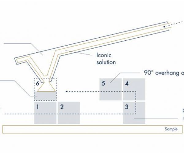 CERES的增材微制造(μAM)技術(shù)基于電化學(xué)沉積。將一個名為iontip的小打印噴嘴浸入電解液中,準(zhǔn)確調(diào)節(jié)的氣壓將包含金屬離子的液體推進(jìn)離子頭內(nèi)部的微通道,液體流量非常小低至每秒飛升。在微通道的末端,含離子的液體被釋放到打印表面上。然后將溶解的金屬離子電沉積為固體金屬原子。